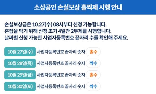 문자를 받지 못한 경우 이날 오전 8시 오픈하는 손실보상 전용 누리집에서 대상 여부를 확인할 수 있습니다. 콜센터(☎1533-3300)와 온라인채팅상담(손실보상114.kr)을 통해서도 확인할 수 있습니다. 이날부터 나흘간(10월 27~30일)은 '홀짝제'가 운영됩니다.