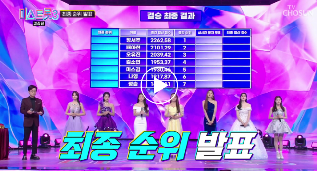 미스트롯3 결승전 후, 최종 우승자와 진선미가 발표되었습니다. 결승전에는 TOP7 참가자가 진출했으며, 이 중에서 최종 '진'은 22점 차이의 박빙 승부 끝에 우승을 차지했습니다. 그 결과, 3대 진의 영예를 안았습니다. 미스트롯3 주인공 탄생의 현장을 다시 한번 느껴보세요!